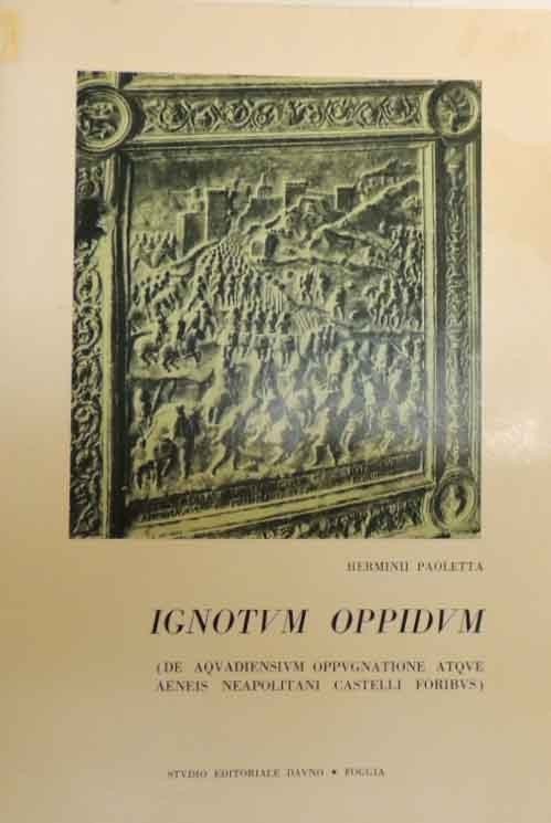 Herminii Paoletta, Ignotum Oppidum. De Acquadiensium oppugnatione atque Aeneis Neapolitani castelli foribus, Studio Editoriale Dauno, Foggia 1966, pp. 66, 3 c. di tav. f.t. ill. b.n., cm 24, br. ed. Collana Quaderni di La Capitanata editi dalla Amministrazione Provinciale di Foggia, n. 4. Titolo in italiano: Erminio Paoletta, Borgo ignoto. L'assedio di Accadia e le bronzea porta che lo raffigura a Castel Nuovo in Napoli. II premio nel XV Certame Capitolino 1964. Ristampa dell’edizione romana con traduzione e nuove annotazioni. Testo latino a fronte. Traduzione italiana del testo con il quale Erminio Paoletta guadagnò il secondo premio nella XV edizione del Certamen Capitolino, competizione internazionale di prosa latina indetta dall’Istituto di Studi Romani. Ignotum Oppidum vuole essere un omaggio all’eroismo mostrato dalla città di Accadia in occasione del suo famoso assedio, avvenuto nell'ambito della contesa tra Angioini ed Aragonesi per la conquista del Regno di Napoli. Il sovrano aragonese, Ferrante d'Aragona, il 21 luglio del 1462, strinse d'assedio la cittadina, che si difese per ben 19 giorni, prima di cedere ed essere messa a ferro e a fuoco. Tale evento è raffigurato in due pannelli nella bronzea porta conservata nel Maschio Angioino di Napoli. Leggere tracce d’uso, per il resto molto ben conservato. Raro.