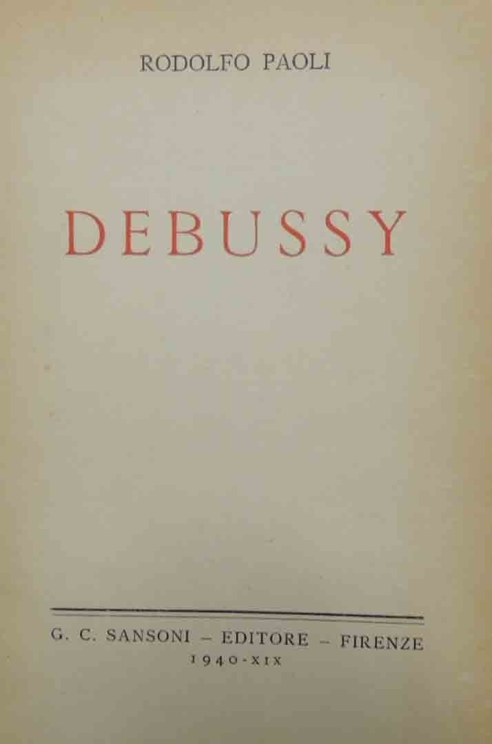 Rodolfo Paoli, Debussy, G. C. Sansoni Editore, Firenze 1940, pp. XI, 259, 4 c. di tavv. f.t. ill. b.n., cm 20, br. ed. Collana Biblioteca Sansoniana Musicale, n. 2. Sovraccoperta mancante. Leggere tracce d’uso, qualche sporadica sottolineatura e annotazione a lapis, minime fioriture, ma nel complesso copia ancora in condizioni discrete e perfettamente fruibile.