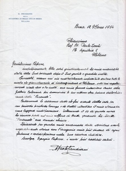 lettera manoscritta e firmata di Paolo Candiani di 1 facciata datata Brera, 12 Marzo 1954 su carta intestata "Il Presidente della Accademia di Belle Arti di Brera Milano" in filigrana dell'accademia; buon es.