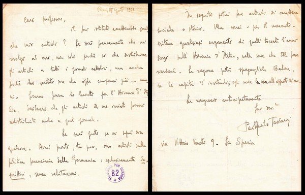 lettera manoscritta e firmata di Paolo Emilio Taviani di 2 facciate datata 28 agosto 1941; minimo strappetto al margine sup. ma buon es.