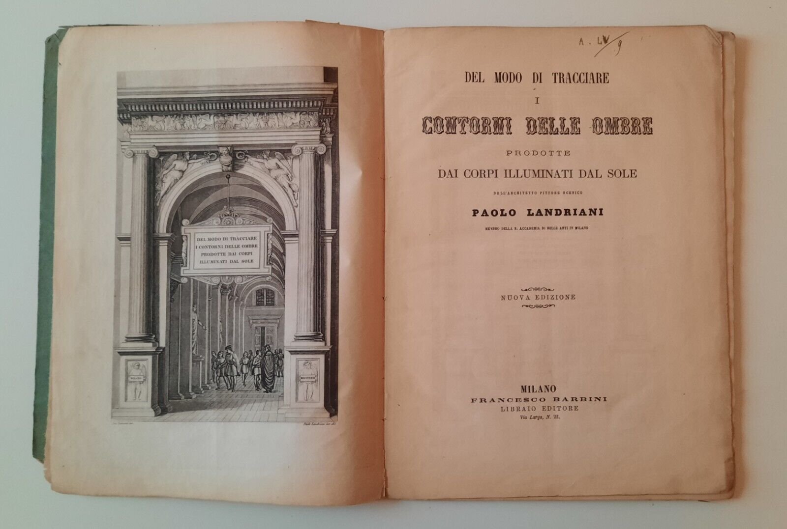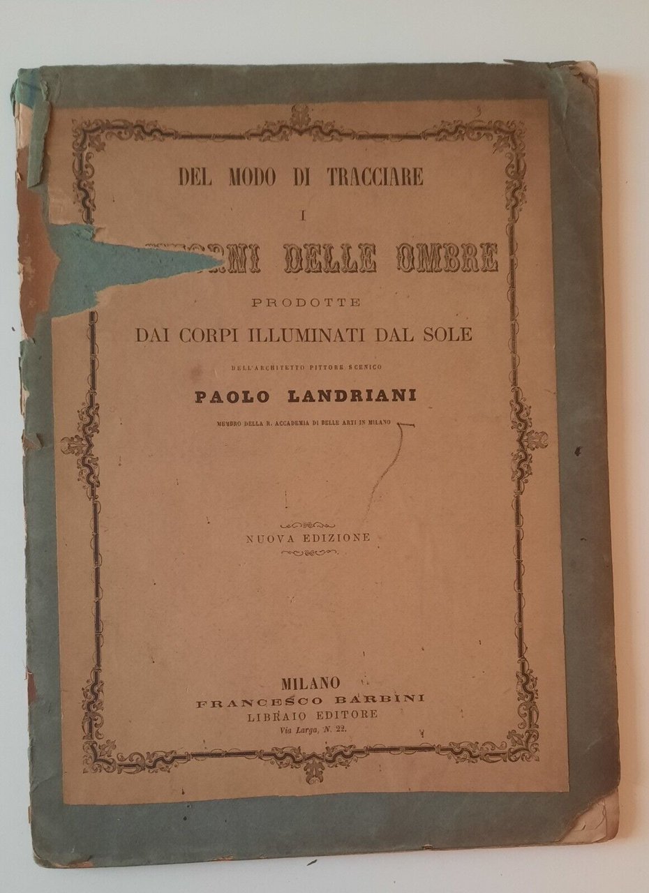 PAOLO LANDRIANI DEL MODO DI TRACCIARE I CONTORNI DELLE OMBRE PRODOTTE DAI CORPI ILLUMINANTI DAL SOLEMILANO F. BARBINI In 4°, legatura cartonata con illustrazione applicata, 18 tavole in b/n.Strappi e mancanze alla copertina, legatura allentata.