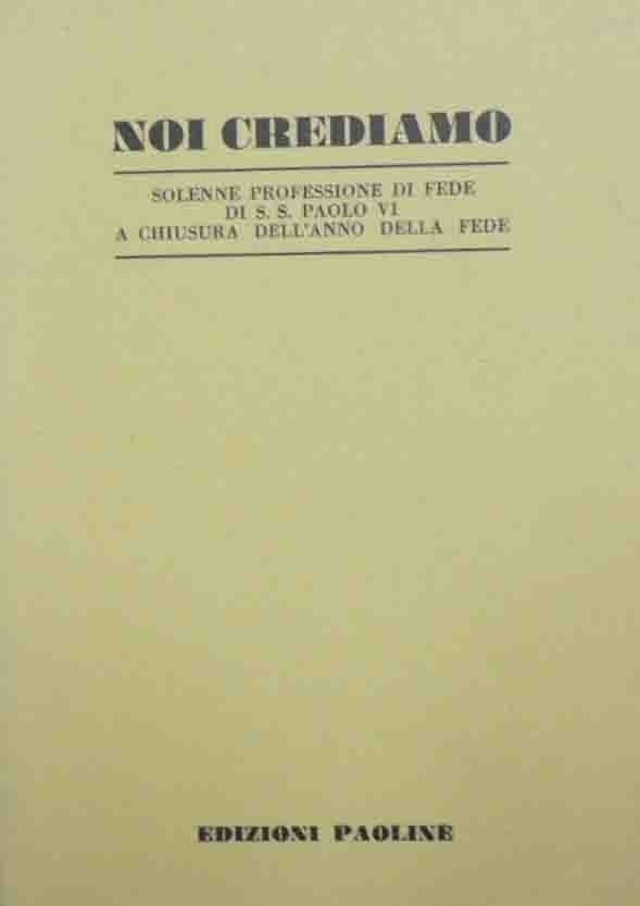 Noi crediamo. Solenne professione di fede di S. S. Paolo VI a chiusura dell’anno della fede, Edizioni Paoline, s.l. (ma stampato a Roma, presso la Tip. Figlie di S. Paolo) 1968, pp. 15, cm 16, pubblicazione spillata. Collana Il Pastore. Serie I, n. 176. Descrizione fatta sulla base della prima di copertina. Perfetto.