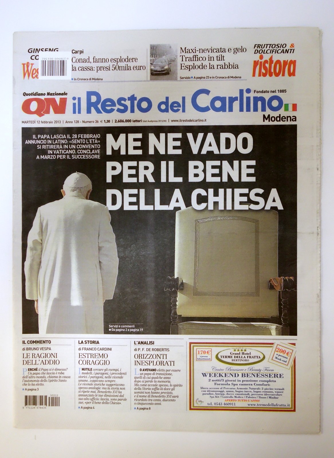 PAPA BENEDETTO XVI RATZINGER DIMISSIONI IL RESTO DEL CARLINO 12/2/2013 COMPLETO | Libri antichi e moderni |