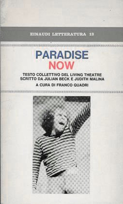 Paradise Now: Collective Creation of the Living Theatre. Written down by Judith Malina and Julian Beck. "The play is a voyage from the many to the one and from the one to the many. It is a spiritual voyage and a political voyage. It is a voyage for the actors and the spectators. It begins in the present and moves into the future and returns to the present. The plot of The Revolution. The voyage is a vertical ascent toward Permanent Revolution. The Revolution of which the play speaks is The Beautiful Non-Violent Anarchist Revolution." — Testi: Quadri Franco, Malina Judith et al. pagg. 306; BN; rileg. brossura. Editore: Einaudi, Torino, 1970.