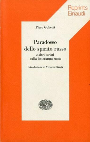 XXVII, 139 p. ; 20 x 12 cm. Reprints Einaudi, 86. Il «Paradosso» gobettiano intreccia strettamente due momenti: quello letterario, costituito da una galleria, lacunosa ma coerente, di ritratti di scrittori russi di sorprendente precisione e vivacità; e quello ideologico, di un'ideologia che non reprime la sensibilità poetica, ma certamente la impronta del suo stimolo. Introduzione di Vittorio Strada. . Brossura editoriale, coperta di cartoncino flessibile colorato (bianco e arancio). Carta interna leggermente ingiallita, qualche sottolineatura a penna rossa, per il resto esemplare integro, da studio. Codice libreria 6971.