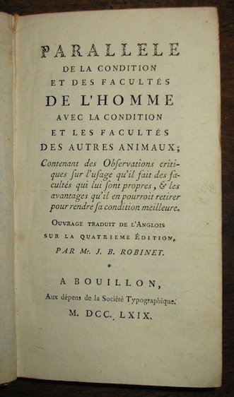 Parallèle de la condition et des facultés de l’Homme avec la condition et les facultés des autres animaux. Ouvrage traduit de l’anglois sur la quatrième édition par Mr. J. B. Robinet