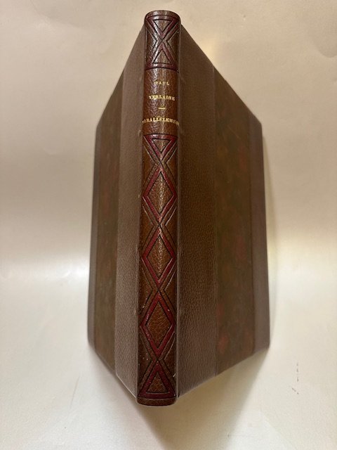 Elegante legatura dell'epoca in pelle, dorso con mosaico di pelli di colore diverso con motivi geometrici bordeaux e marroni, titolo in oro, taglio superiore dorato, striscia centrale dei piatti in carta decorata identica alle carte di sguardia, cofanetto decorato e con profili in pelle, ottime condizioni. Eleganti acqueforti erotiche di Edouard Chimot. Tiratura 198 esemplari numerati, il nostro uno dei 110 (135) firmato da Chimot su vélin de Rives, e contenente le acqueforti in due stati di cui alcuni in colore. Elegante ex libris a stampa di Marcellus Schlimovic. Bellissimo esemplare.