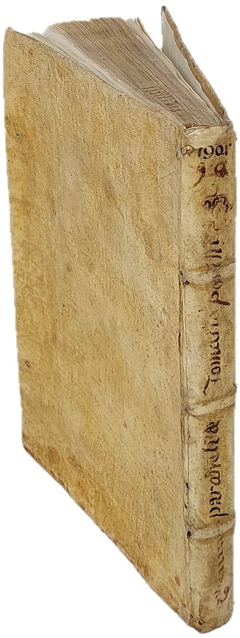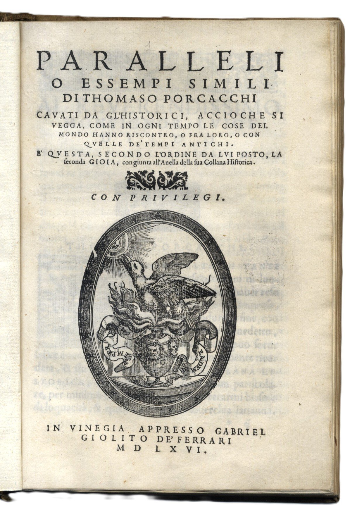 >in-4 piccolo, pp. (32), 197, (3), legatura coeva in pergamena, titolo ms. al dorso. Sul titolo e al verso dell'ultimo f. impresa dello stampatore, iniziali istoriate. Prima edizione di questo trattato storico basato sul parallelismo di fatti e personaggi. Concepito come continuazione delle ''Cagioni delle Guerre'' il volume uscì nella ''Collana Historica'' ideata dal Giolito e di cui facevano parte scritti di grandi storici del passato (Polibio, Plutarco, Tucidide), nella sezione chiamata ''Anella'', e di storici contemporanei, nella sezione ''Gioie'', di cui il presente è appunto il secondo volume. T. Porcacchi fu dotto letterato e ricercatore (Castiglione Aretino 1530-1582). Ottimo esemplare. Bongi II, 231-32. BMC 535. Manca ad Adams.