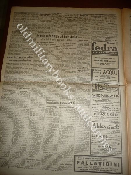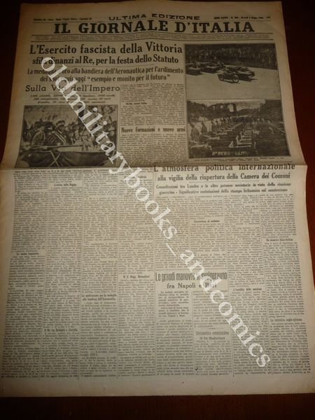 DESCRIZIONE: Giornale IL GIORNALE D'ITALIA 9/6/1936 composto da 8 pagine Numero con la cerimonia per la celebrazione della conquista dell'Impero, ad un mese dalla stssa, e medaglia d'Oro all'arma dell'Aeronautica. CONDIZIONI: Ottime. PESO / WEIGHT: 50 grammi without package