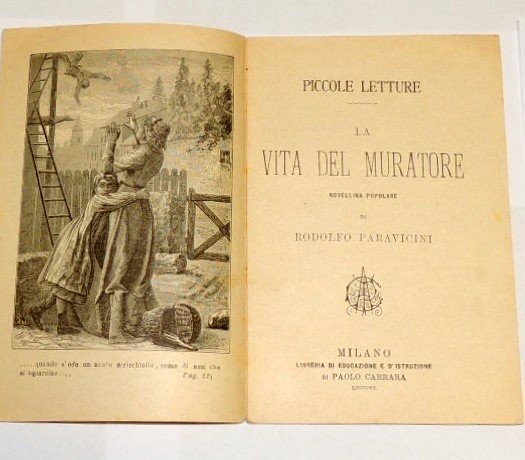Rodolfo Paravicini, La vita del muratore. Novellina popolare, Paolo Carrara Editore, Milano 1885, pp. 26, ill. b.n., cm 18. Collana Piccola Biblioteca Popolare di educazione e ricreazione, n. 42. Qualche mancanza alla copertina, ma interno integro.