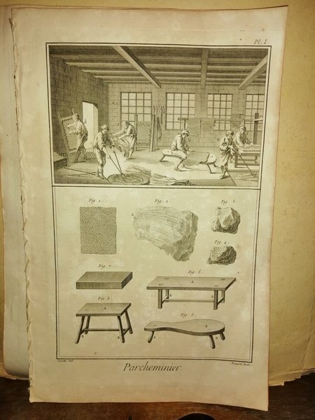 In-folio (39,5 cm) (2) VII c. (di tav.) Cartoncino con carta marmorizzata. Tavole delineate da Lucotte ed incise da Benard. Proviene da Encyclopédie ou Dictionnaire raisonné des sciences, des arts et des métiers, opera enciclopedica in 35 voll., di cui 11 di tavole, pubblicata a Parigi tra il 1751 e il 1772. Diretta da D. Diderot, intendeva esporre i progressi compiuti dall'umanità in tutti i campi, con particolare riguardo alla tecnica. Le voci furono scritte da letterati, specialisti, medici e ingegneri, tra cui J.-B. D'Alembert, Voltaire, C. Montesquieu, J.-J. Rousseau, E. Condillac. "Recueil de Planches, sur les sciences, lse arts liberaux, et les arts mechaniques, avec leur explication. Septieme livraison, ou huitieme volume. 254 planches. A Paris, chez Briasson, rue Saint Jacques, à la Science, 1771". French language. Lingua francese