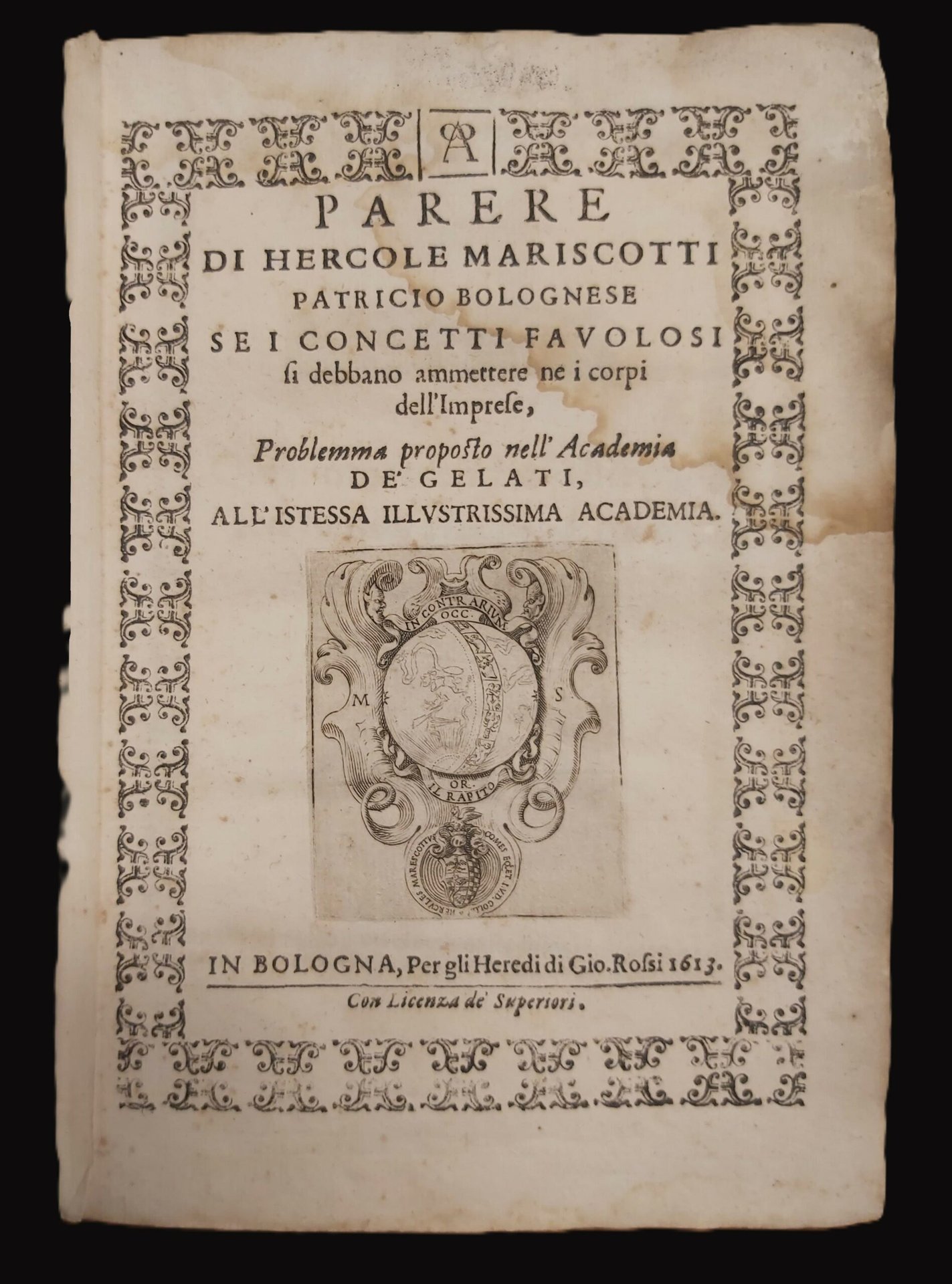 in-8, pp. (14), 76, (12), rileg. post. con carta azzurra settecentesca. Fregi e testa. in legno. Bel front. con tit. entro fregio xilogr. e vignetta inf. con la sfera celeste e le armi della famiglia Marescotti, ripetuta anche a carta K4v con la sua spiegazione. Ediz. orig. e unica. Rara secentina sull'araldica e gli emblemi, argomento discusso dall'A. all'Accademia bolognese dei Gelati. Fantuzzi V, pp.250 riferisce questo autore come "Juniore" da non confondersi con l'omonimo sacerdote bolognese che usava lo pseudonimo di Ercole Filogenio. Il nostro autore, figlio di Bartolomeo e Maddalena de' Pepoli, fu dottore in Legge e letterato, accademico con lo pseudonimo di "Rapito" come compare anche nello stemma dell'Accademia al frontespizio. E' questa l'unica opera nota. Orlandi, Scrittori bolognesi, p.106. Alone lieve marginale nelle prime cc. Rara edizione. [744]