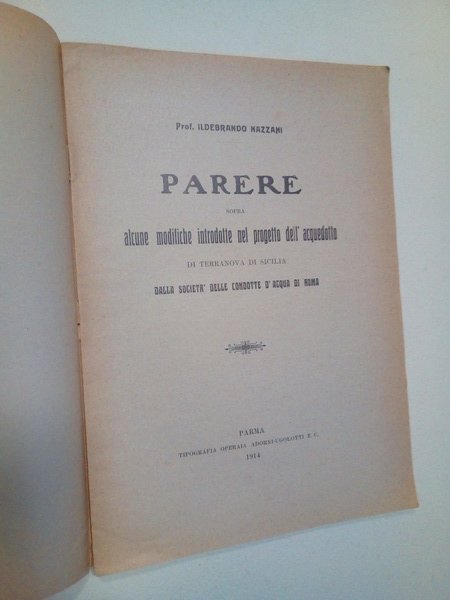 Parere sopra alcune modifiche introdotte nel progetto dell'acquedotto di Terranova di Sicilia dalla Società delle Condotte d'Acqua di Roma.