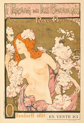 >Litografia a colori (cm 64x46), presentata in elegante cornice in stile decò. Titolo lungo il margine superiore, note tipografiche nella parte inferiore, firma ''R. du Coudrey'' in basso a sinistra. Composizione realizzata per il numero di giugno 1898 della rivista ''The Poster''. Illustrazione in perfetto stile Déco nella quale emerge una giovane donna delineata in colori tenui, raffigurata mentre si inebria del profumo dei fiori delle isole Borromee, la silhouette è in contrasto con lo sfondo scuro. L'affiche pubblicizza il romanzo dello scrittore francese René Boylesve (1867-1926), ambientato nelle isole del lago Maggiore, appartenente al filone ''passion douloureuse''. Esemplare in buono stato di conservazione.