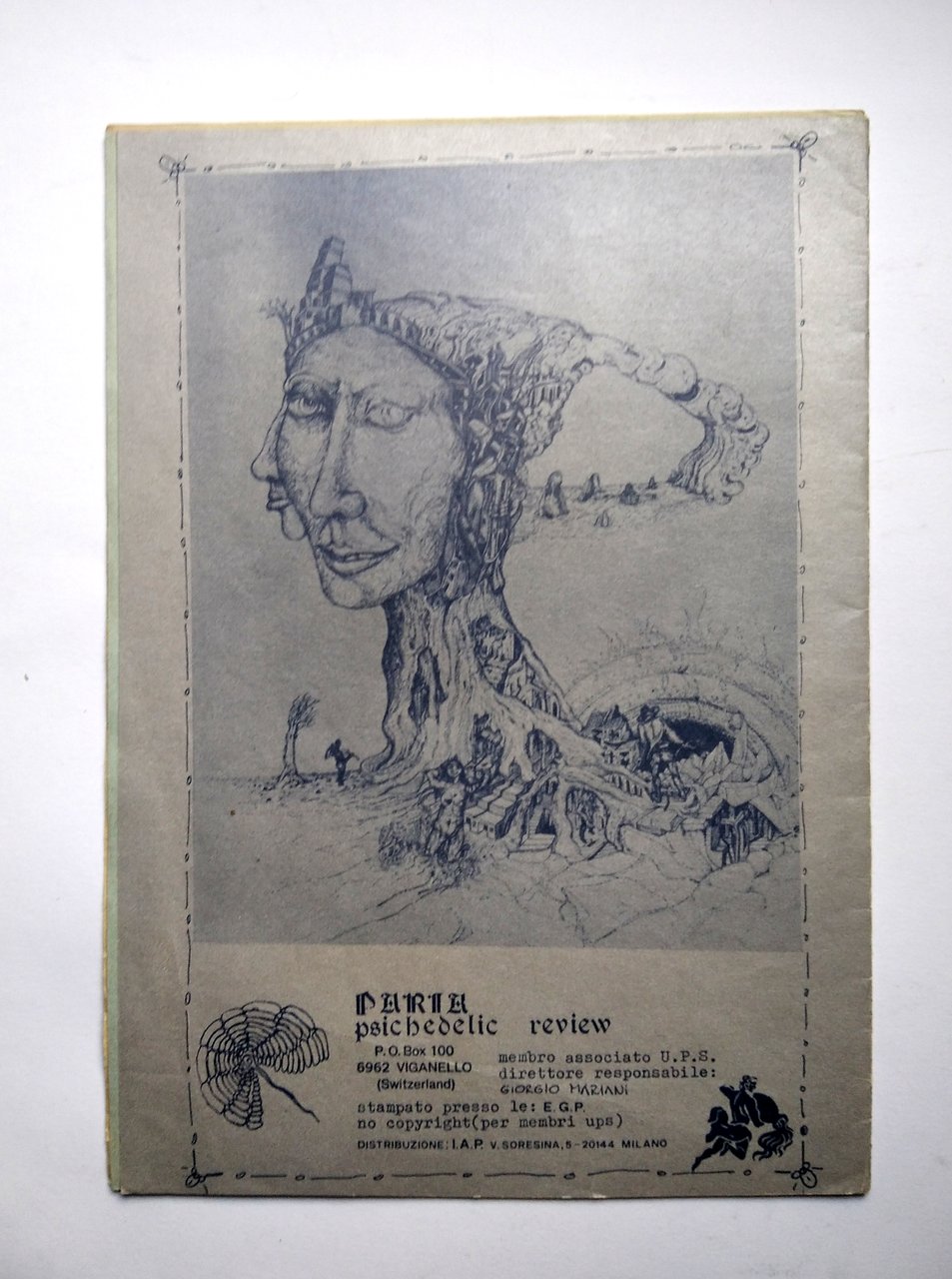 Brossura (cm 29 x21) pag 12+4 (copertina). Collaboratori: Mizio Turchet, Shantianada Gianni, Franco Beltramelli e altri Freak ticinesi. Disegno di copertina di Rupert V.D. Linden. Rivista underground del Canton Ticino fondata da Antonio Rodriguez nel 1969 e pubblicata fino al 1975 in due serie distinte. La seconda serie fu distribuita in Svizzera, Italia, USA, nel circuito di Re Nudo e Stampa Alternativa. -- Ogni numero è un'esplosione d'illustrazioni a colori con testi scritti a mano in un intarsio di disegni allucinati e simbolismi psichedelici (Matteo Guarnaccia)