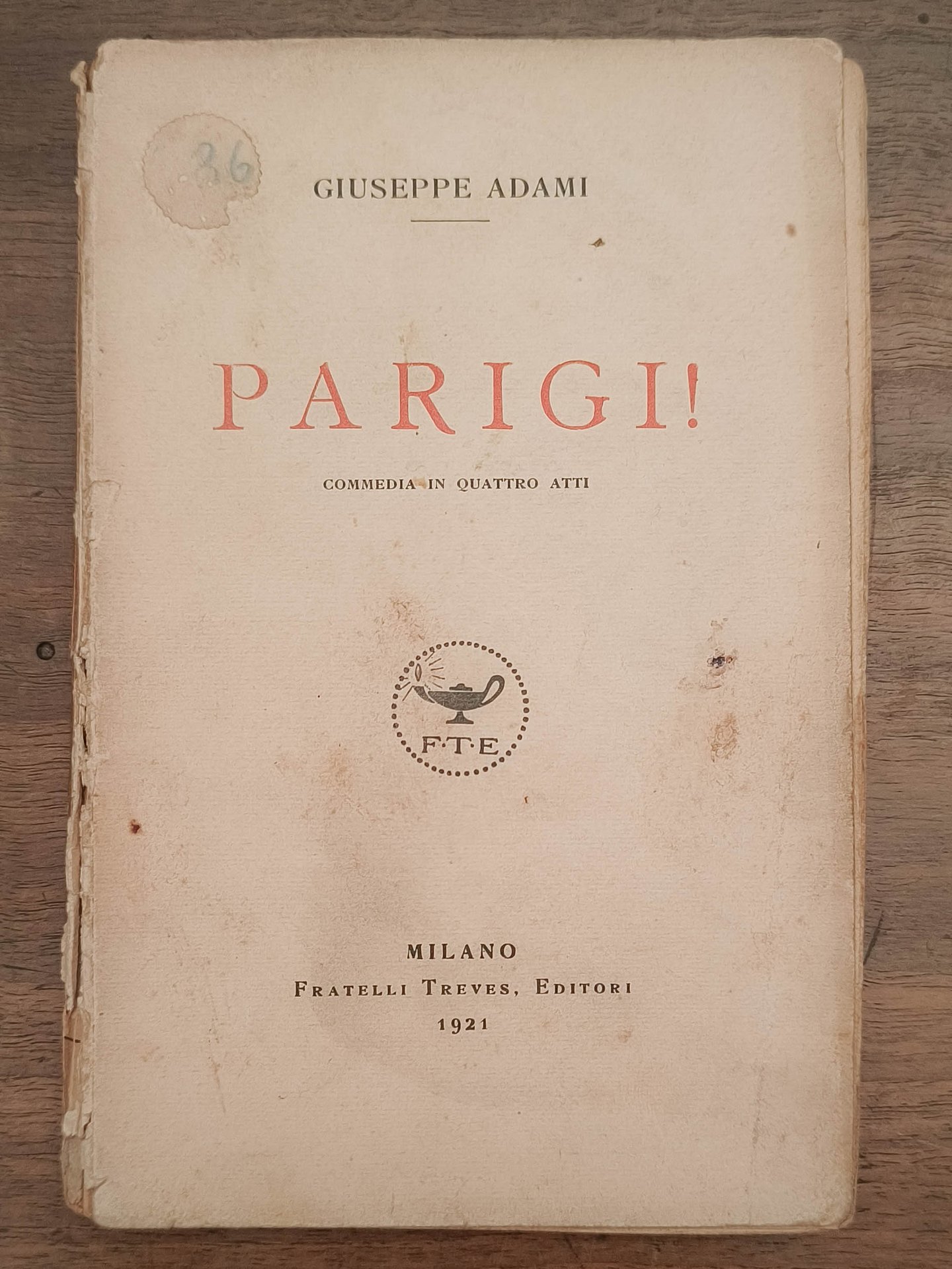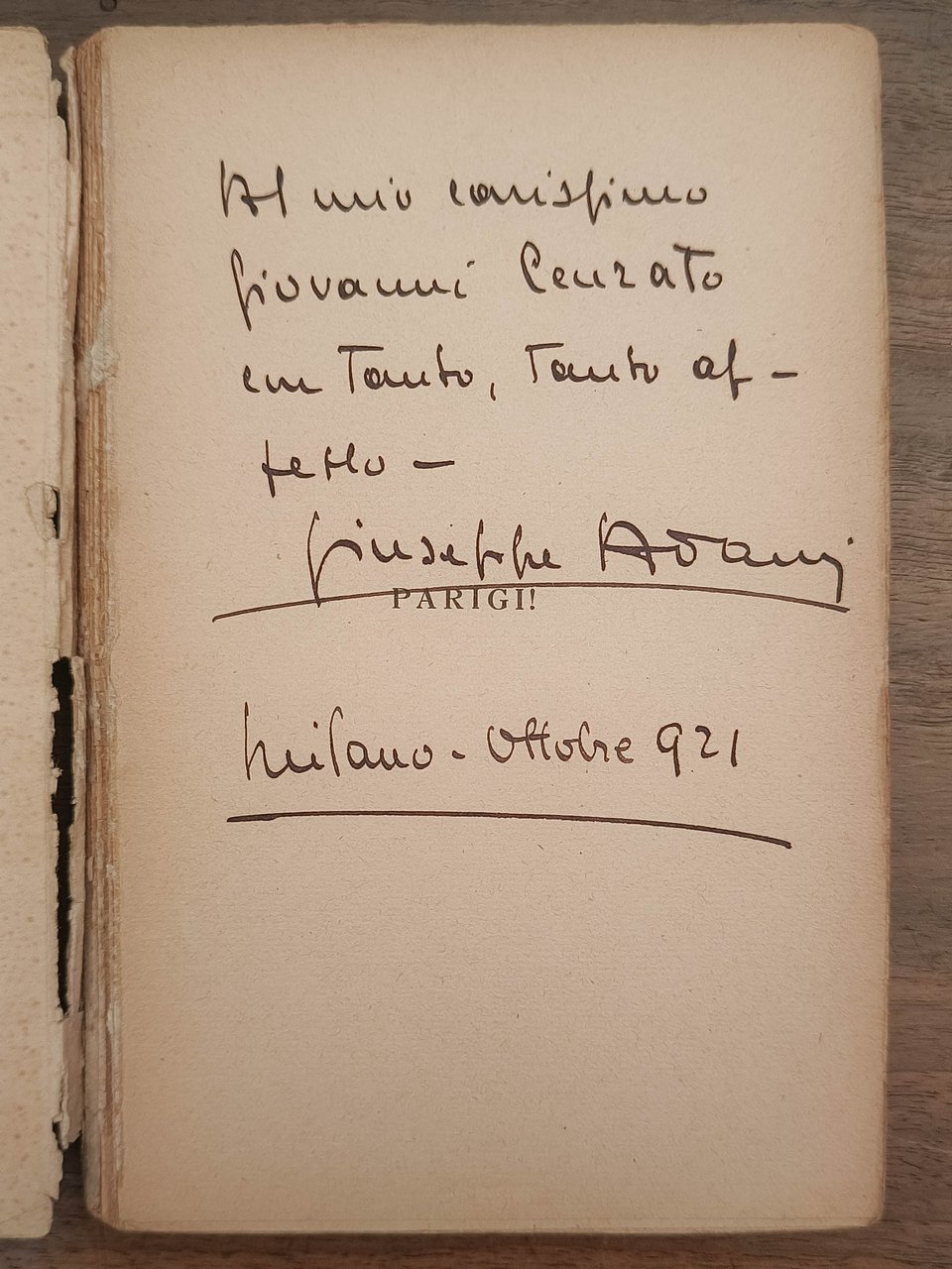 Parigi! Commedia in quattro atti, Milano, Fratelli Treves Editori, 1921. Cm 18,8. Pp. 157. Brossura editoriale. Dorso e piatto parzialmente staccati. Segni d'usura e macchie alla copertina. Dedica autografa dell'autore a Giovanni Cenzato (giornalista per il Corriere della Sera, autore e commediografo) datata ottobre 1921.