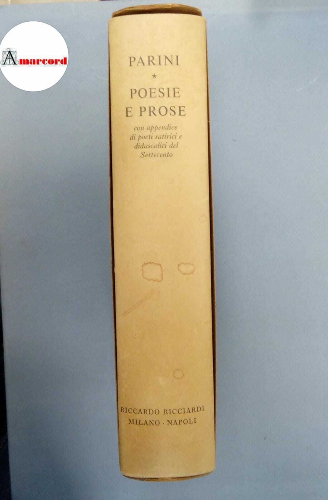 Parini Giuseppe, Poesie e prose, Ricciardi, 1951, in-8, rilegato a tutta tela con sovraccopertina e custodia copripolvere, pp.960. Con una appendice di poeti satirici e didascalici del Settecento. Volume a cura di Lanfranco Caretti. Numero 48 della collana "La letteratura italiana. Storia e testi".