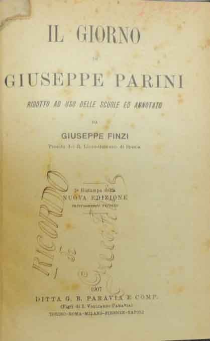 Il giorno di Giuseppe Parini. Ridotto ad uso delle scuole ed annotato da Giuseppe Finzi, Ditta G. B. Paravia e Comp., Torino 1907, seconda rist. della nuova ed. interamente rifatta, pp. VII, 141, cm 19, legatura in mezza tela muta con titolo manoscritto al dorso. Firma d’appartenenza e segnatura di collocazione al frontespizio. Un piccolissimo restauro al frontespizio, minime fioriture,per il resto molto ben conservato. Raro.