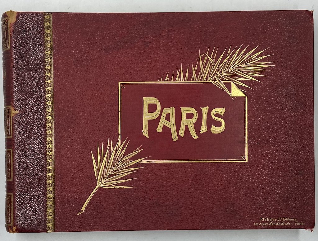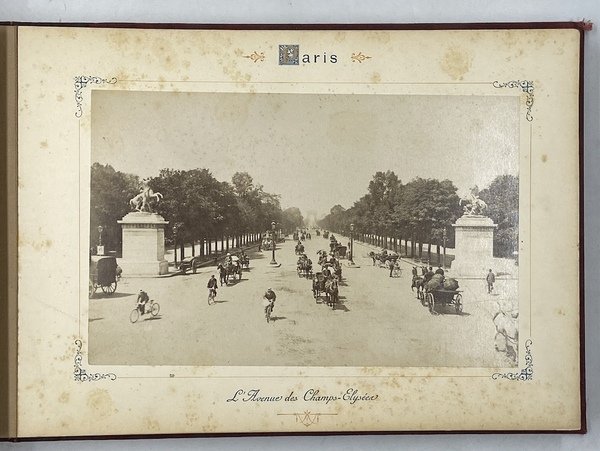Album in mezza pelle rossa con piatti in percallina, titolo entro cartiglio e fregio fitomorfo sul piatto anteriore, fregio e titoli impressi a caldo sul dorso, cm 27x19, 12 carte in cartoncino con tagli dorati, didascalie e cornici a stampa in blu e rosso, 24 stampe d’epoca ai sali d’argento (albumine o asterotipi) cm 18.5x12 circa. Uno strappo sulla prima sguardia, mendato al verso, e lievi segni del tempo sulla legatura; qualche lieve fioritura sui cartoncini ma complessivamente ben conservato. Le fotografie, con didascalia esplicativa a stampa sul cartoncino di supporto, raffigurano animate vedute della Parigi fine secolo, affollata di passanti, tiri a cavallo e biciclette. Tra gli scatti più affascinanti una Rue de Rivoli con truppa militare in marcia, il Nouveau Louvre, le affollatissime Avenue de l’Opera e Place Vendôme, la Tour Eiffel, il Boulevard des Italiens, la Place de la Bourse con le carrozze pubbliche a cavallo. Dell’esempio di souvenir della capitale del XIX Secolo pubblicato dall’editore Rives, noto per la produzione di carte per la stampa all’albumina, composto di immagini accattivanti e ben contrastate.