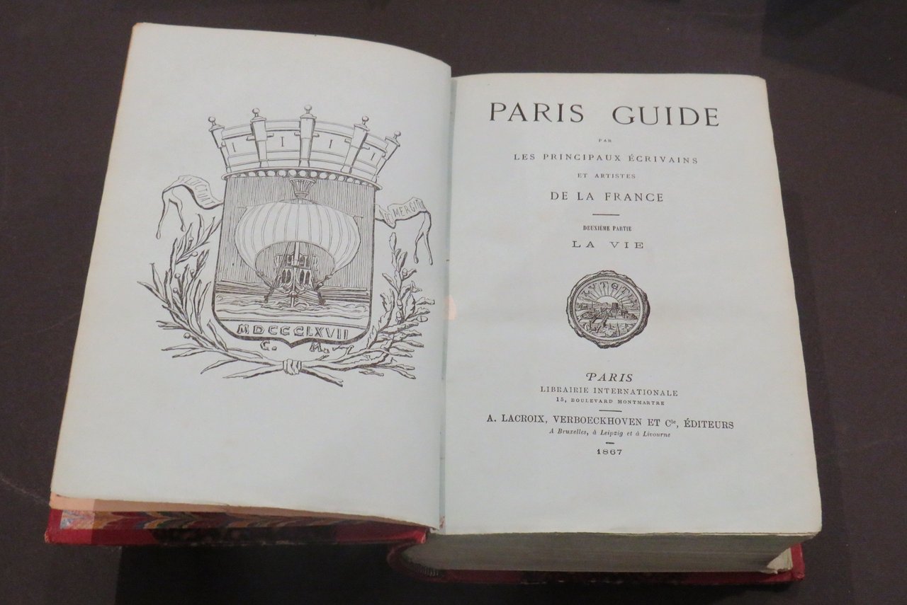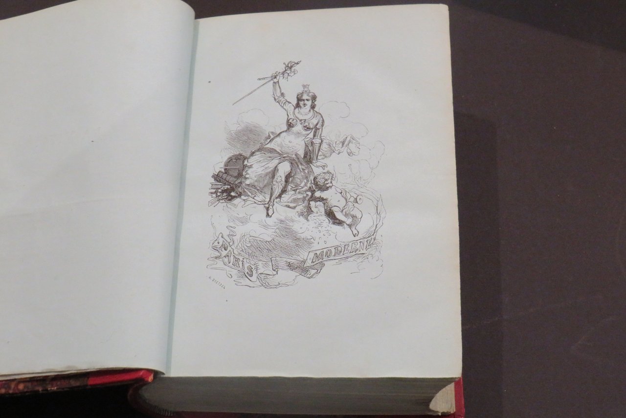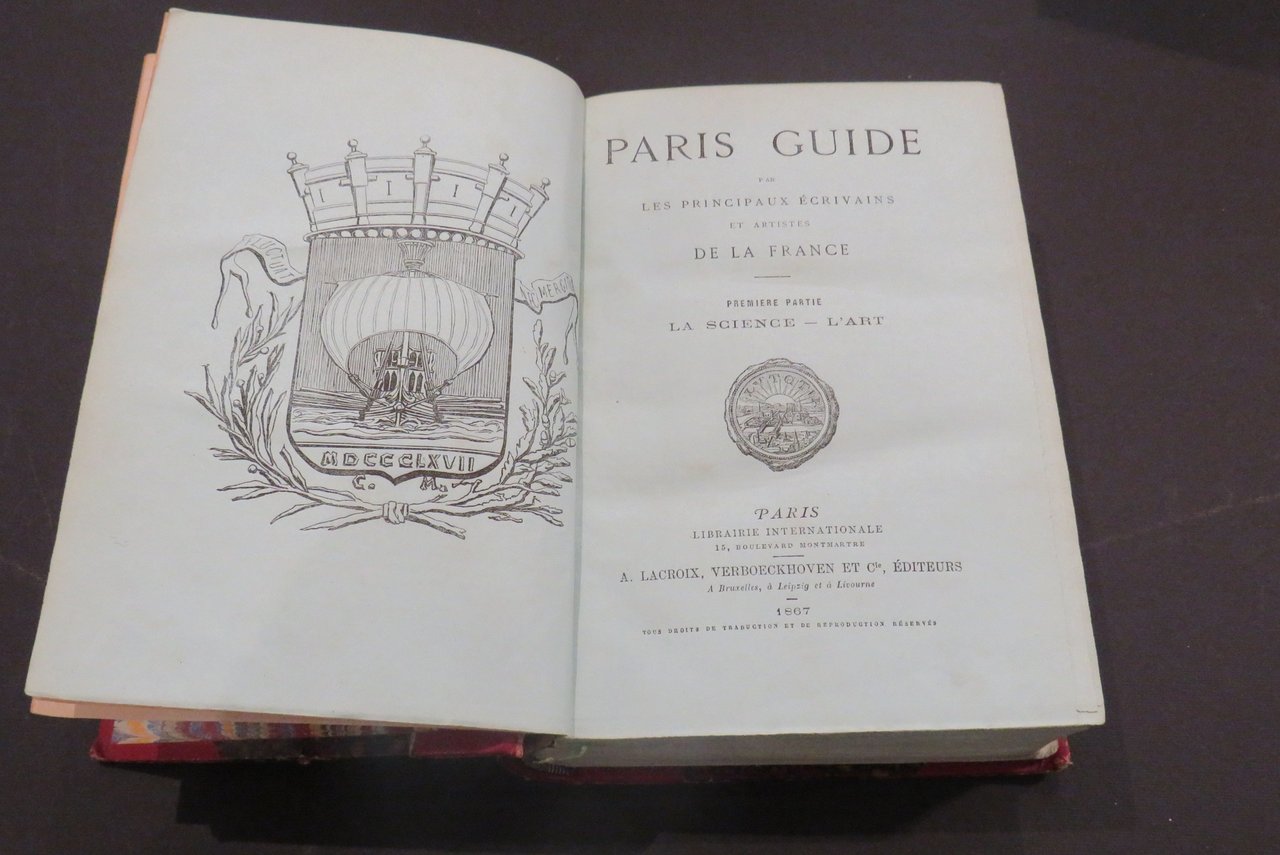 Par les principaux Ecrivains et artistes de la France. Première partie (La Science-L'Art); Deuxième Partie (La Vie). Paris, Librairie Internationale, 1867. In -8, 2 voll., pp. (paginazione continua) XLIV-902-27-(116), XIV -(14)-905/2135-34, con 134 tavole fuori testo (di cui 16 a doppia pagina). Legatura mezzo marocchino ad angoli con titolo e fregi in oro ai dorsi a 5 nervi, tagli superiori dorati. Edizione originale. Splendida guida pubblicata in occasione dell'Esposizione Universale del 1867, contiene scritti originali di V. HUGO; L. BLANC, E. RENAN, SAITE-BEUVE, LITTRE', J. MICHELET, FIRMIN DIDOT, TH. GAUTIER, E. QUINET, VIOLLE-LE-DUC, H. TAINE. Ottimo esemplare su "papier bleu". Carteret III-454/456.