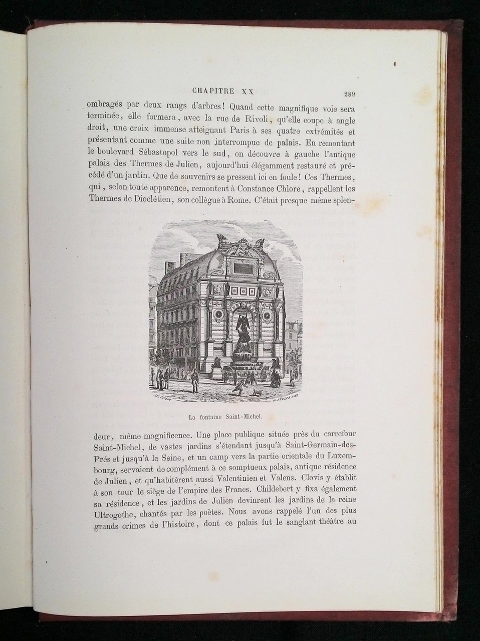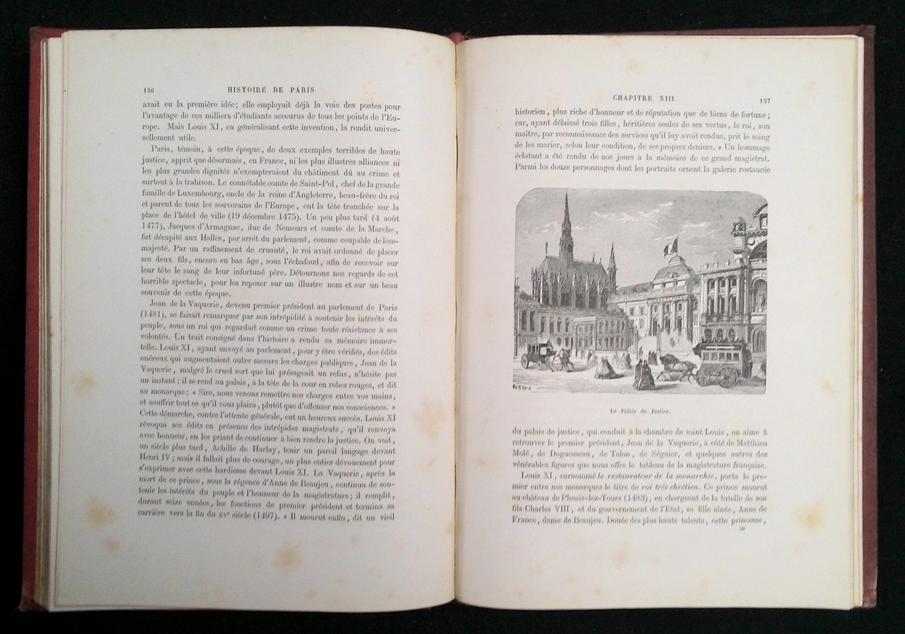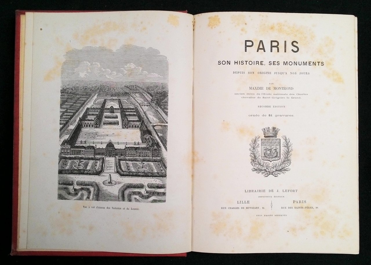 4to (286x206 mm); leg. editoriale in cartonato telato rosso, con decori e disegni impressi e colorati ai piatti ed al dorso; pp. 311; 81 incisioni in b.n. nel testo e f.t., bella marca editoriale al frontespizio. Seconda edizione riccamente illustrata di questa storia di Parigi, dall'origine alla fine dell'800. Prov.: quattro etichette d'appartenenza al contropiatto anteriore di M.lle Emilia Bastin frequentatrice del Pensionnat des Filles de la Croix nel 1893. Rif.: IT\ICCU\BA1\0027478 (ed. del 1867). OCLC, 458146823 (1 copia in Fr). Cond.: Qualche rossore e fioriture; tracce d'uso alla legatura; opera in buone condizioni generali.
