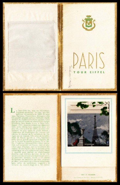 pieghevole di 4 facciate con all'interno la veduta della Torre Eiffel con effetto tridimensionale; buon es.