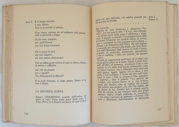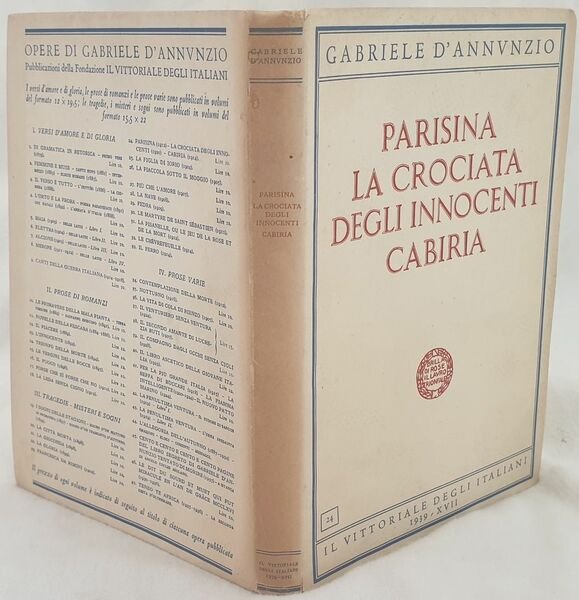Edizione del 1939 della tragedia "Parisina la crociata degli innocenti cabiria" dello scrittore, poeta, drammaturgo, politico e giornalista Gabriele D'Annunzio (1863-1938). Volume n. 24 della collana edita dalla fondazione "Il Vittoriale degli italiani". In ottime condizioni. Brossura editoriale in ottime condizioni generali con lievi usure ai margini e dorso. Legatura in buone condizioni. All'interno le pagine si presentano in ottime condizioni con rare fioriture. In 8. Dim. 22,5x16,5 cm. Pp. 202+(1). Edition of 1939 of the tragedy "Parisina la crociata degli innocenti cabiria" by the writer poet dramawriter politician and journalist Gabriele D'Annunzio (1863-1938). Volume n. 24 of the series edited by the fondation "Il Vittoriale degli italiani". In very good conditions. Editorial cover in very good general conditions slightly worn in the extremities. Binding in good conditions. Inside pages are in very good conditions with occasional foxing. In 8. Dim. 22,5x16,5 cm. Pp. 202+(1).