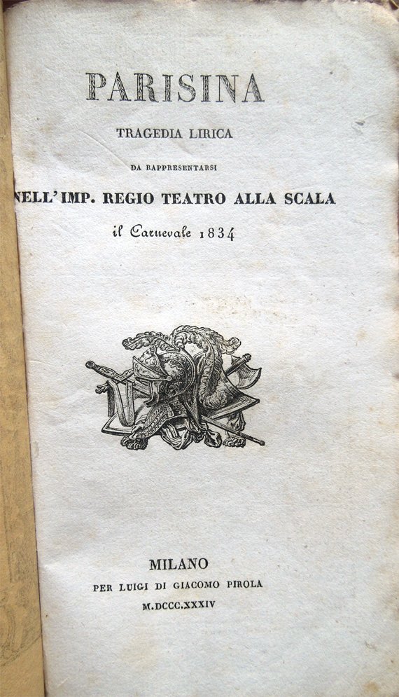 In-16° (17,4 x 10,5 cm), pp. 44, copertina editoriale con titoli entro cornice decorata. Qualche normale segno d'uso e del tempo alla copertina. Alla copertina anteriore, firma d'appartenenza e data scritte da mano coeva; vignetta al frontespizio. Qualche leggero segno d'umido alle pagine, per il resto ben conservato. La première dell'opera era andata in scena al Teatro di via della Pergola di Firenze il 17 marzo 1833. Musica del Maestro Gaetano Donizetti, scenografia curata da Domenico Menozzi, Baldassarre Cavallotti e Carlo Ferrari. Personaggi ed interpreti: Azzo, signor di Ferrara, Berardo Winter; Parisina, moglie di Azzo, Enrichetta Lalande; Ugo, che poi si scopre figlio d'Azzo, Francesco Pedrazzi; Ernesto, ministro d'Azzo, Luciano Mariani; Imelda, damigella di Parisina, Felicita Bayllou; Cori e comparse: Cortigiani, Cavalieri, Damigelle, Gondolieri, Armigeri e Soldati. La scena si svolge in parte nell'isola di Belvedere sul Po, in parte a Ferrara, nel XIV secolo. Musicisti. Maestro Direttore della Musica: Cesare Pugni; Al cembalo: Giacomo Panizza e Giovanni Bajetti; Primo Violino, Capo e Direttore d'Orchestra: Eugenio Cavallini; Altro primo Violino, in sostituzione al sig. Cavallini: Giovanni Cavinati; Capi dei secondi violini a vicenda: Giacomo Buccinelli e Giuseppe Rossi; Primo Violino per i Balli: Ferdinando Pontelibero; Altri primi Violini, in sostituzione al sig. Pontelibero: Francesco De Bayllou e Giuseppe De Bayllou; Primo Violoncello al Cembalo: Vincenzo Merighi; Altri primi Violoncelli in sostituzione al sig. Merighi: Giacomo Gallinotti e Pietro Storioni; Primo Contrabbasso al Cembalo: Francesco Hurth; Altro primo Contrabbasso in sostituzione al sig. Hurth: Fabiano Ronchetti; Prime Viole: Carlo Maino e Pietro Tassistro; Primi Clarinetti a perfetta vicenda: Ernesto Cavallini e Felice Corrado; Primi Oboe a perfetta vicenda: Carlo Yvon e Giovanni Daelli; Primi Flauti: per l'Opera, Giuseppe Raboni, pel Ballo, Filippo Marcora; Primo Fagotto: Antonio Cantù; Primo Corno da caccia: Agostino Belloli; Prima Tromba: Giuseppe Viganò. Arpa: Antonia Zanetti Sperati. Direttore del Coro: Giulio Cesare Granatelli; Istruttore del Coro: Filippo Luchini; Editore della Musica: Giovanni Ricordi; Vestiaristi proprietarj: Briani e Figlio, e Mondini; Direttore della sartoria: Giovanni Mondini; Capi sarti: Giacomo Colombo e Paolo Veronesi; Berrettonaro: Giosuè Paravicini; Sorvegliante alle ordinazioni del vestiario e guardarobiere dell'impresa: Ercole Bosisio; Attrezzista proprietario: Giuseppe Fornari; Macchinisti: Fratelli Abbiati; Parrucchiere, Innocente Bonacina; Capi illuminatori, Antonio Abbiati - Giuseppe Pozzi. Ballerini. Compositore de' Balli: Giovanni Galzerani; Primi Ballerini serj: Augusto Lefebvre, Francesco Delorge, Elisa Vaque Moulin, Paola Ancement, Amalia Braschi, Carolina Bonalumi; Primi Ballerini per le parti: Antonio Ramacini, Marietta Conti, Giuseppe Bocci, Tomaso Casati, Carolina Casati, Leopoldo Pagliaini,Teresa Aman; Primo ballerino per le parti giocose: Ippolito Philippe; Primi ballerini di mezzo carattere e per le parti: Giovanni Baranzoni, Carlo Della Croce, Eduardo Viganò, Antonio Caprotti, Antonio Rugali, Carlo Rugali, Francesco Villa, Antonio Rumolo, Bartolomeo Pincetti, Gaetano Croce, Fioravanti Boresi, Costantino Ravetta, Elia Bertuzzi, Rachele Cazzaniga, Giuseppina Rumolo, Luigia Rumolo, Silvia Angiolini, Carolina Ramacini, Eugenia Braschi; Imperiale Regia Scuola di Ballo. Maestri di Perfezionamento: Claudio Guillet e Anna Giuseppina Guillet; Maestro di Ballo: Carlo Villeneuve; Maestro di Mimica: Giuseppe Bocci; Allieve: Teresa Aman, Carolina Frassi, Luigia Sassi, Giuseppa Caffulli, Rosalia Molina, Elisabetta Monti, Teresa Merli, Carolina Conti, Adelaide Frassi, Angela Morlacchi, Teresa Morlacchi, Adelaide Volpini, Antonia Bussola, Luigia Bellini, Luigia Monti, Metilde Bertuzzi, Michelina De Vecchi, Marianna Cottica, Luigia Marzagora, Antonia Zucchinetti, Tamiri Angelini, Giuseppa Sala, Giuseppa De Vecchi, Augusta Domenichettis, Virginia Rizzi, Adelaide Pirovano. Signori: Aurelio Quattri, Solone Viganoni, Giovanni Battista Gramegna, Pasquale Borri, Domenico Senna, Paolo Meloni. Ballerini di Concerto: n° 12 Coppie. Giovanni Galzerani, celebre coreografo, nacque a Porto Longone nel 1790. In giovane età entrò nel Collegio Militare della Nunziatella, ove stette fino ai 17 anni. Alla morte del' padre, abbandonò gli studi militari, e si dedicò al ballo, frequentando la rinomata scuola della Dupré. Ebbe quindi inizio la sua carriera teatrale: eseguì i suoi balli a Milano, a Napoli, a Vienna, e in molti altri teatri italiani. Morì nel 1865. A giudizio dei critici il Galzerani è il coreografo che più si distinse nella prima metà dell'Ottocento per la fantasia e la creatività.