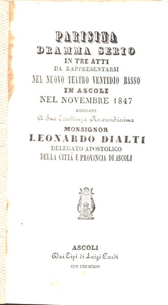 Libretto d’opera. Nuovo Teatro Ventidio Basso, Novembre 1847. Elenco dei personaggi completo dei nomi degli interpreti tra cui Enrichetta Nissen e Ettore Martucci.