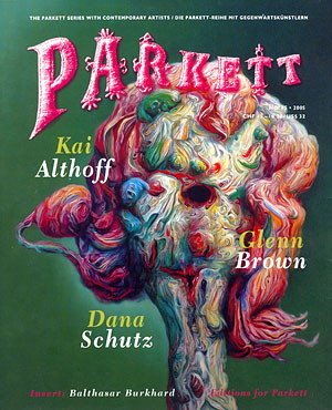 For over two decades Parkett has presented unparalleled collaborations with key international contemporary artists, and paired their work with discussions by esteemed writers and critics. Issue No. 75 spotlights Kai Althoff, Glenn Brown, and Dana Schutz. Althoff's portfolio includes both erotically charged paintings of men in uniform and innocent "coming-of-age" colored pencil illustrations, sensuous work--at once homoerotic, punk, and devotional--that radiates a somber luminosity. Then there are his awkward, life-size installations, which appear to be made by some sort of drunken puppeteer. The "master" Glenn Brown employs a sorcerer's bag of techniques to produce retro-Rococo paintings and sculptures, maximally intricate, hyper-composed, and rendered with the intense detail of a tripped-out sci-fi animator. His fully-realized, uninhabitable dreamscapes reflect on the bizarre world in which we all live. Dana Schutz's painterly virtuosity and devotion to the medium also look back in time, but her brilliant, confessional exposition is very much of the now. Be the subject a dissected corpse, a dazed hippie chick, or her own boyfriend on the beach, Schutz's painted world, her "monster mash," is decadently radiant and ecstatic, and also frighteningly ghoulish. Text contributors include Jordan Kantor, Viet Loers, Oliver Koerner von Gustorf, Jennifer Higgie, Trevor Smith, Jàrg Heiser, Michael Lobel, Daniel Baumann, Rachel Kent, Duncan Fallowell, Angelika Affentranger-Kichrath, Gian Maraniello and Rudolf Schmitz. Plus a photographic insert by Balthasar Burkhard, and spine by Carsten Nicolai. — F.to: 21x26; COL e BN; rileg. brossura. Editore: Parkett, Zürich, 2006.