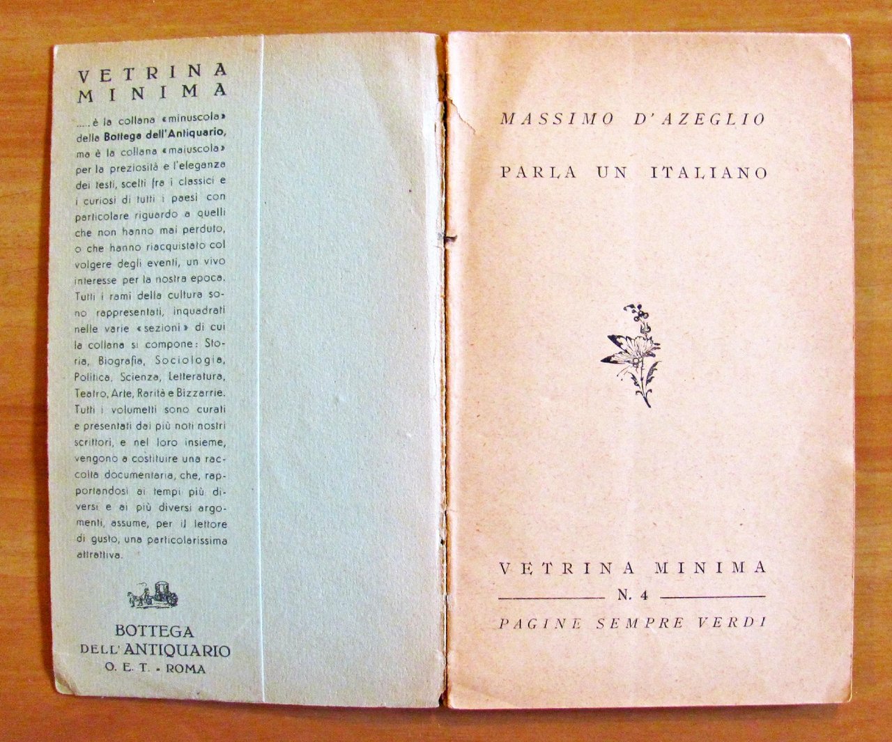 Collana "Vetrina Minima - Pagine Sempre Verdi" N.4. Bella illustrazione in copertina. Organizzazione Editoriale Tipografica - Roma, s.d. anni '40. Brossura editoriale con ali con tracce d'uso al dorso con piccola mancanza al margine alto. 10,5x17,5; pp.78. BUONISSIMO STATO