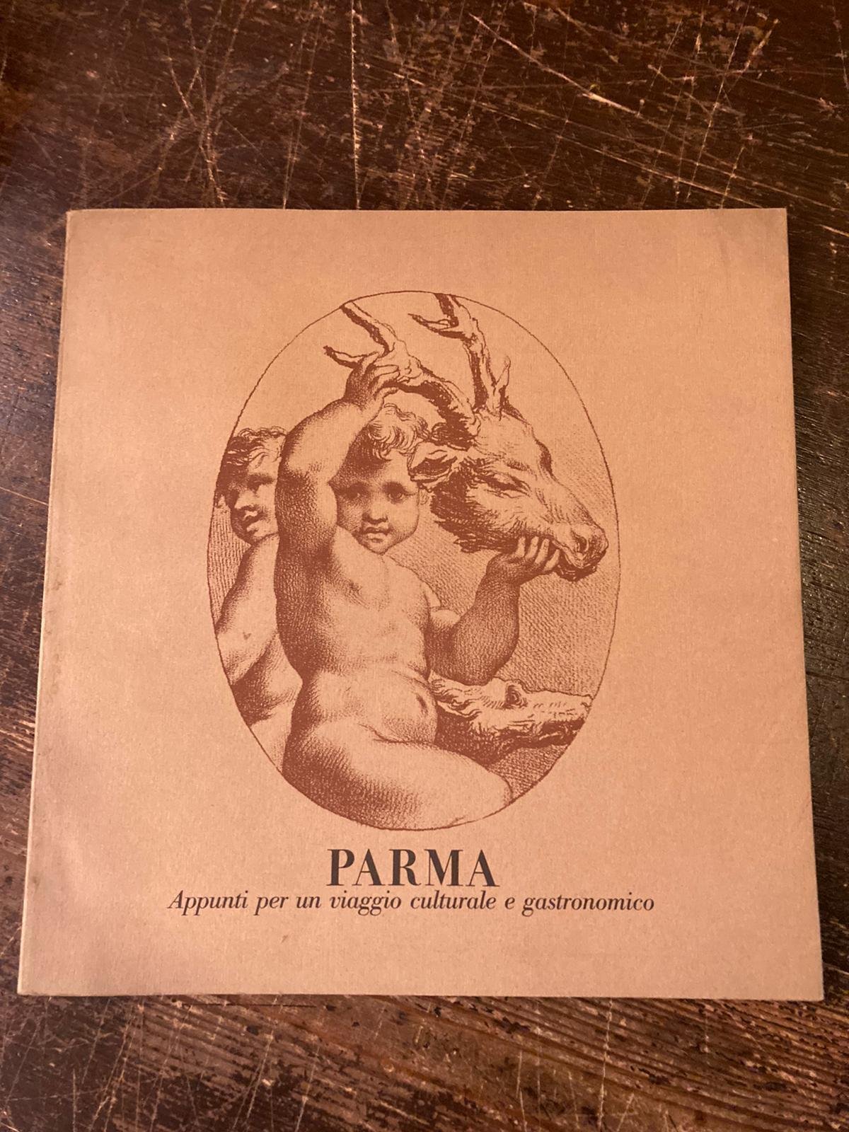 In-8° quadrato (22.5x21.5 cm), brossura editoriale con sovracoperta alla francese figurata con alette, piatti e contropiatti figurati. Pp 94, illustrazioni e fac-simili in nero e seppia nel testo e fuori testo. Minimi difetti al dorso. Interessante quanto avanguardistica (1977) pubblicazione di presentazione delle specialità gastonomiche inquadrate socio-culturalmente. La curatela editoriale è condotta direttamente da Franco Maria Ricci che spiega anche il significato del simbolo (trademark) scelto per il consorzio Parma Alimentare: un sigillo ottagonale (tale è la pianta del battistero di Parma) contenente un motivo floreale neoclassico con a basamento un etichetta bodoniana.