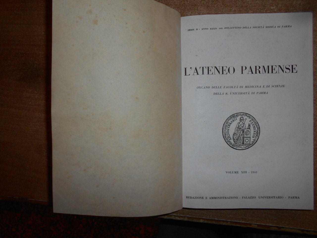 (PARMA) L' ATENEO PARMENSE 1941 organo delle Facoltà di Medicina e di Scienze della R. Università di Parma con ex libris D. CAMPANACCI. In-8°, m-tela con titolo in oro sul dorso. viii, 440 pp. con numerose figure in nero n.t. Ottimo stato. Uff. salon. sporta 11