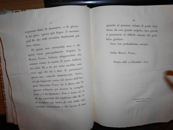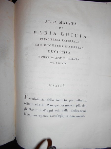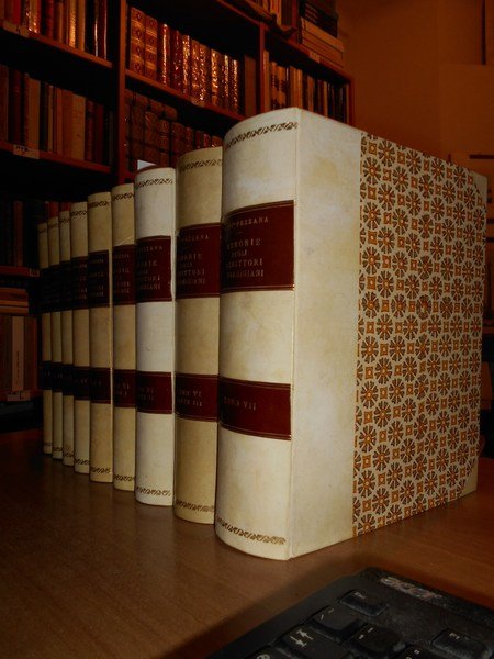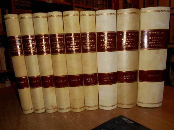 Parma, dalla Stamperia Ducale Tipografia,1825 - 1833. In-4°, m. pergamena con angoli, titoli in oro entro due tasselli in pelle ai dorsi. 9 volumi. (viii), lxviii, 296 pp.; xlviii, 324 pp.; (viii), cxii, 270 pp.; (viii), xl, 352 pp.; (viii), 423 pp.; xxi, (iii), 363 pp., con un ritratto in ovale raffigurante Sua Maestà Maria Luigia inciso in rame da Alcò Antonio nello Studio Isac e Toschi fuori testo. (iv), 458 pp.; (ii), da pp. 459 a pp. 1013, (5) pp. xii, 692 pp. Fondamentale e insuperabile lavoro, fatica del Padre Affò (Busseto 1741 – Parma 1797) cui dedicò molti anni di studio e ricerca, contiene le biografie e opere degli scrittori parmigiani, in ordine cronologico, fino alla fine del XVII secoli, anche scrittori meno noti, minori o “che per soverchia modestia nulla composero o le cui opere furono trascurate e consunte” (dall’ ”Avviso a chi legge”). L’opera fu dedicata a Ferdinando di Borbone, Duca di Parma Piacenza e Guastalla. L’Affò, minore osservante, storico ed erudito, fu per anni bibliotecario della Palatina di Parma. A lui si deve anche una incompiuta storia della città di Parma e una storia di Guastalla. La continuazione dell’opera, nel secolo successivo, è dovuta ad Angelo Pezzana (Parma 1772-1862) che la dedica a Maria Luigia Duchessa di Parma, e contiene anche un’ampia biografia dell’Affò con il catalogo delle opere edite ed inedite. Pezzana fu anche bibliotecario della Palatina e valido bibliografo, nonchè direttore della Gazzetta di Parma, ma soprattutto i sui studi ebbero applicazioni sulle opere dell’Affò che si impegnò ad ampliare e portare a termine. Pregevole copia della più importante e attendibile opera sugli scrittori parmigiani, nell’insieme completo dei 4 volumi aggiuntivi del Pezzana e in elegante legatura uniforme. Splendido esempl. in barbe. Uff. A - I - 6 - 2
