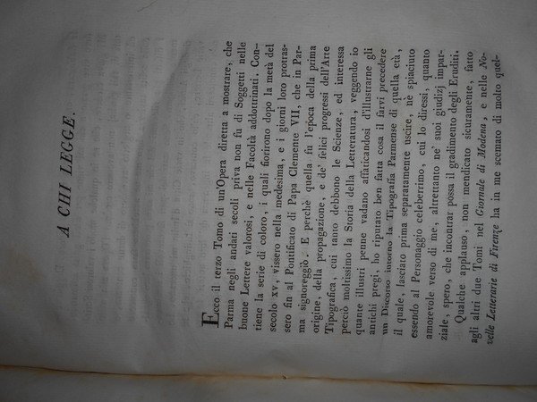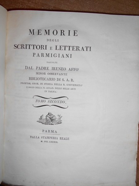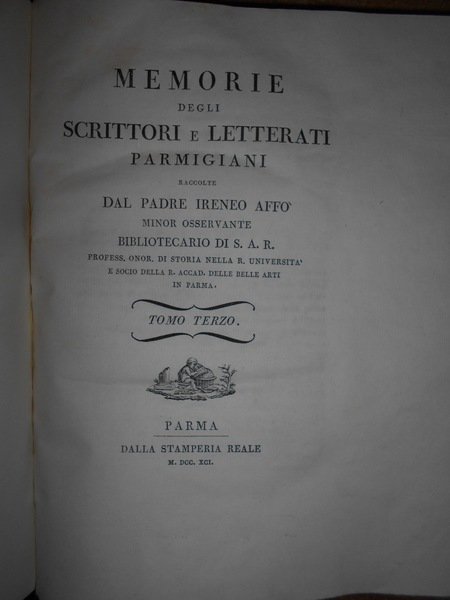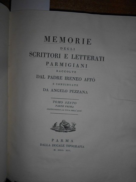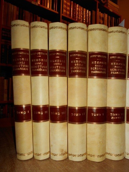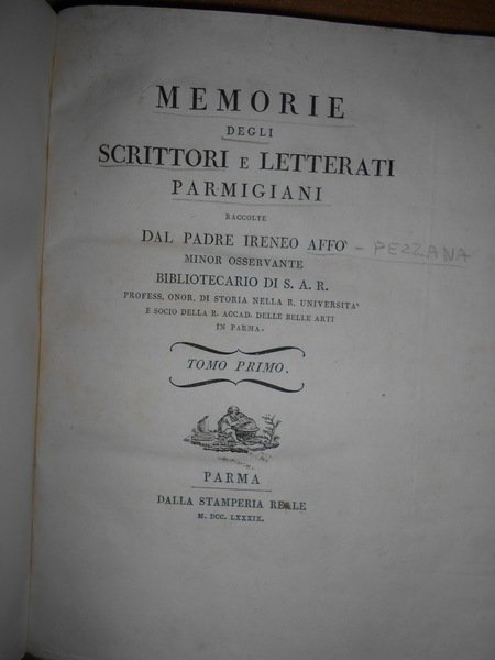 MEMORIE DEGLI SCRITTORI E LETTERATI PARMIGIANI RACCOLTE DAL PADRE. MINORE OSSERVANTE BIBLIOTECARIO DI S.A.R. PROFESSORE ONORARIO. PARMA, STAMPERIA REALE, 1789-1797. UNITO: PEZZANA ANGELO. MEMORIE DEGLI SCRITTORI PARMIGIANI. CONTINUATE DA.
