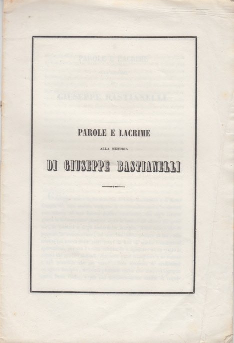 In-8 (Cm 27 x 18,3), pp. 11, brossura editoriale. Ordinari segni del tempo. Comprende un elegia in lingua francese. MOLTO BUONO - Giuseppe Bastianelli figlio di Luigi Bastianelli e Ester Cappellini mori' a causa di una "febbre cerebrale" all'eta di 13 anni.