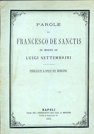 In-8°, pp. 19, brossura editoriale verde acqua listata a lutto. Perfetto stato. Prima edizione, rara, di questo commosso ricordo desanctisiano del grande patriota, scrittore e critico appena scomparso. Precedono anche alcuni cenni dovuti a Francesco Torraca. 'In questo secolo non vedo nessuna grandezza morale pari a questa. E se in noi non è spento ancora il senso della vera grandezza, se sappiamo distinguere ancora gli eroi dalle vanità clamorose, siamo fieri che Luigi Settembrini è nato in Napoli, e siamo lieti che per clemenza della storia i grandi soli sopravvivono, e coprono con la loro grande ombra molte vergogne e molte bassezze'.