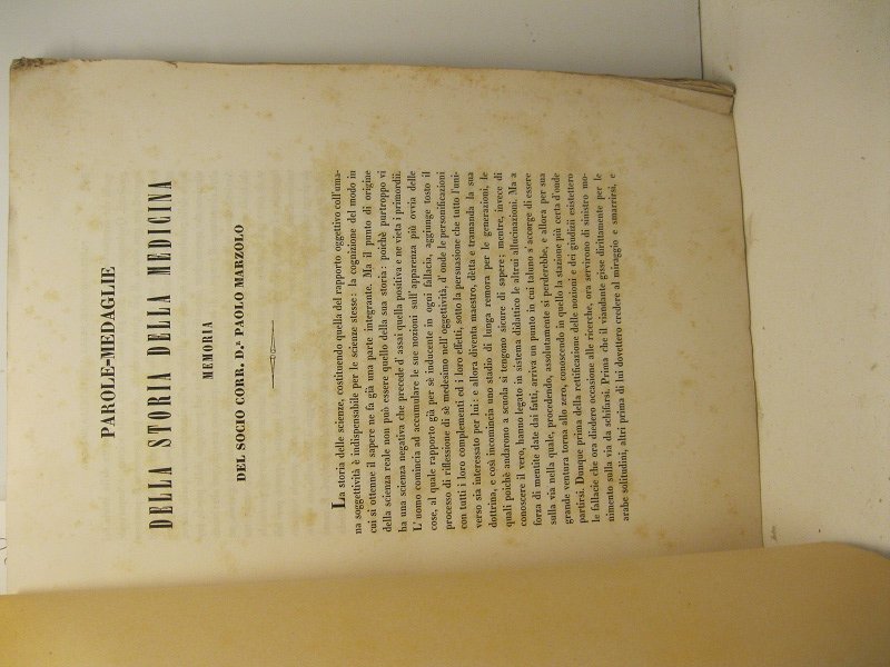 In 4, pp. 551-648. Usuali fioriture alle cc. Br. muta coeva. 'La memoria del Dott. Marzolo e' brano di esteso lavoro destinato a porre in luce le testimonianze che la storia puo' trarre dai materiali delle lingue e delle parole che cosi' convertonsi in monumenti, e in medaglie. Avviene quindi che si puo' studiare cio' che ora pensa il volgo, in fatto di medicina, nella etimologia delle parole (anche di lingue defunte) dove si conserva l'espressione ingenua, non del buon senso, ma si' del senso comune. (Brugnoli, Bibliografia delle scienze mediche., vol. II, 1859, p. 565). Argomenti: Dell'ignoranza dell'anatomia; Funzioni dei visceri; Patogenia; Anteriorita' della chirurgia; Nomi delle riferenti idee sacre; Malattie interne ch'ebbero nomi da fatti esterni; Malattie esterne considerate quasi segni di vizii dell'animo nel paziente; Mezzi sacri nel trattamento delle malattie delle malattie; Origini della materia medica; Origine della dall'osservazione delle forme morbose; Polizia sanitaria; Cronologia delle cognizioni relative alle Scienze mediche; Passaggio delle scienze mediche dall'una all'altra Nazione; Curatori delle malattie.
