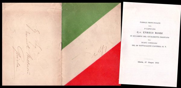 Parole pronunciate dal I Capitano Cav. Enrico Rossi in occasione del giuramento prestato dai nuovi ufficiali del 49 Battaglione Fanteria M. T. Ghirla, 27 Giugno 1915.