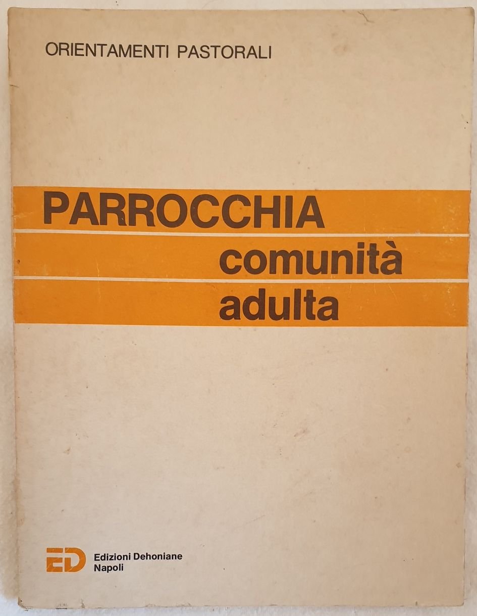 Manuale del 1977 sulla parrocchia comunita adulta All'interno: Il Ministero della Chiesa e i Ministeri nella chiesa, Il cammino della Chiesa attraverso i Ministeri, I consigli pastorali diocesani zonali e parrocchiali oggi in Italia, Crescita ecclesiale e comunita di base in America Latina, Testimonianze e problemi di comunita adulte, Situazione analisi e prospettive di piccole comunita disperse in ambienti rurali, situazione analisi e prospettive di una parrocchia di periferia, situazione analisi e prospettive di una parrocchia media ecc. In buone condizioni. Copertina editoriale in buone condizioni generali con lievi usure ai margini e dorso. Legatura in buone condizioni. Pagine in ottime condizioni. In 16. cm. 17x13. Pp. 187+(3) Manual of 1977 about parish. In good conditions. Editorial cover in good general conditionsslightly worn in the edges and spine. Binding in good conditions. Pages in very good conditions. In 16. cm. 17x13. Pp. 187+(3)