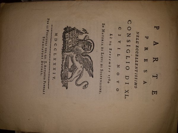 Parte prese nell'eccellentissimo Consiglio di XL civil novo. Li 24 settembre 1784. In materia di lievi di sospensione
