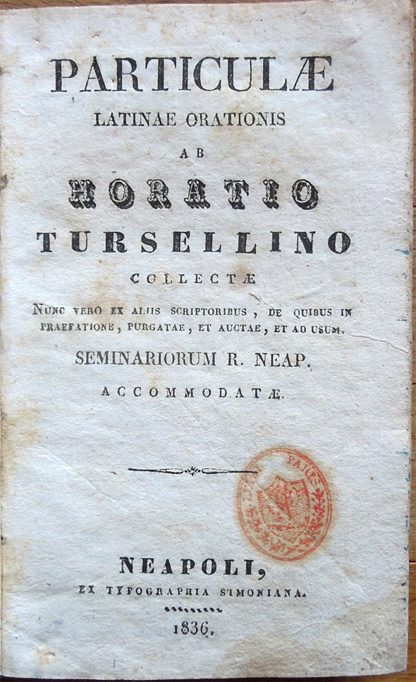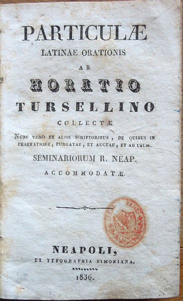 Particulae latinae orationis ab Horatio Tursellino collectae, nunc vero ex aliis scriptoribus, de quibus in praefatione, purgatae, et auctae, et ad usum Seminariorum R. Neap. accommodatae