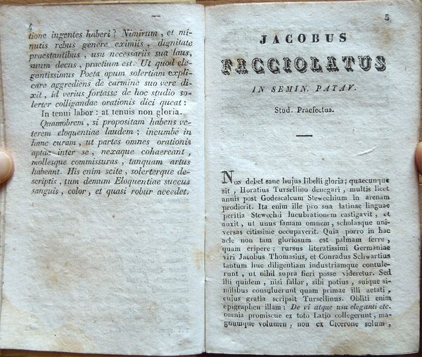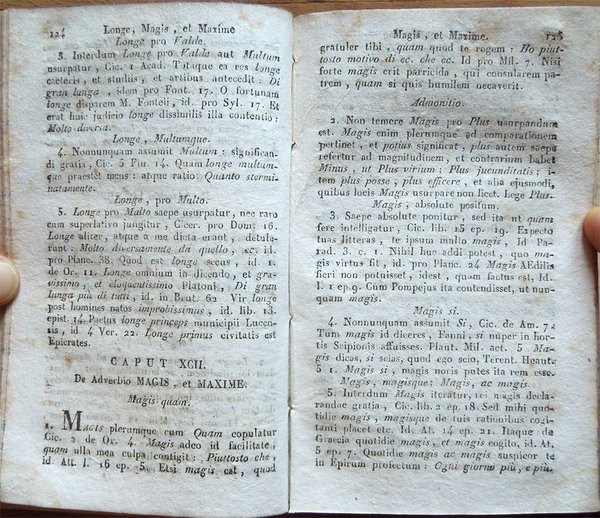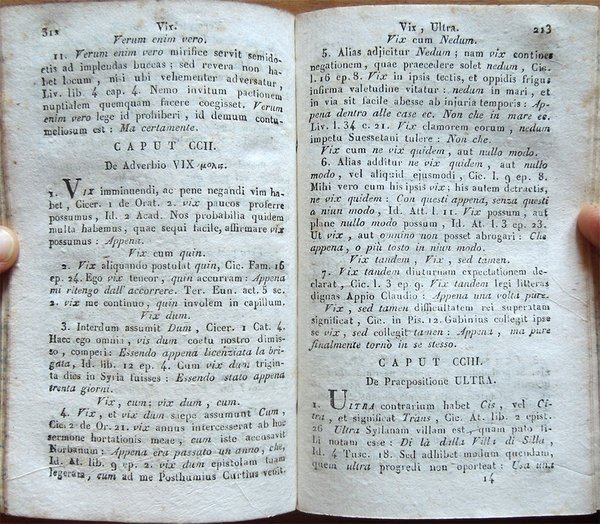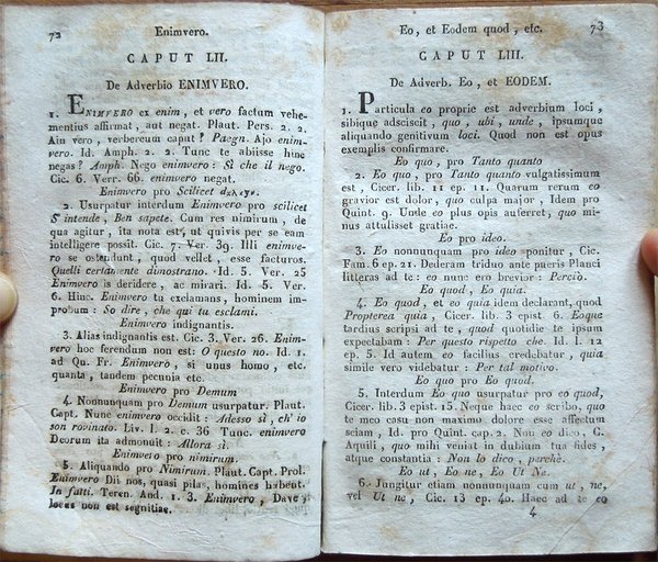 In-16° (15 x 9,3 cm), pp. 456, legatura coeva in piena pergamena. Qualche segno d'uso e del tempo alla legatura, in particolare, aloni al piatto anteriore e mancanza, restaurata, nella parte centrale del dorso. Tagli decorati a spruzzo. Al frontespizio, timbro ovale di appartenenza, coevo, di "Luigi Paris". Note di appartenenza manoscritte ai fogli di guardia. Qualche leggero segno d'umido, per il resto, buon esemplare. Le note manoscritte alle guardie sono di mano del figlio di Luigi Paris, Lorenzo: portano date tra il 1842 e il 1844, epoca in cui, secondo le stesse sottoscrizioni, era «alunno interno nel R. Collegio di Teramo» e sono scritte, oltre che in italiano, in francese, in latino, in greco. Lorenzo, nato nel 1827, morì, a soli venti anni, nel 1847. Luigi Paris, di famiglia originaria di Campli, nacque nel 1797. Frequentò le scuole a Teramo prediligendo lo studio della matematica e della fisica. Fu uomo insigne e di vasta cultura, profondo conoscitore delle lingue greca e latina, ma anche del tedesco, dell'inglese e del francese. Nel 1819 venne nominato professore di matematica sublime e fisica matematica nel Real Collegio di Teramo, incarico che ricoprì sino al 1832 quando, volontariamente, lasciò l'insegnamento. Ricoprì moltissime cariche pubbliche. Competente collezionista di libri, riuscì a costituire una notevole quanto prestigiosa biblioteca che, composta da opere rare e di pregio a partire dal XVI secolo, di prevalente carattere giuridico, oggi si conserva, in parte, presso l'Archivio di Stato di Teramo. Luigi nel 1824 sposò, a Teramo, Teresa Rubini (1805-1856): fu in questo periodo che la famiglia Paris trasferì la propria residenza nel capoluogo aprutino. Dall'unione nacquero Maria (1825-?), Lorenzo (1827-1847), Rosa (1830-1842), Michele (1832-?), Giovanna (1833-?) e Antonia (1835-1857). La perdita di Rosa appena dodicenne e di Lorenzo, ventenne, lo segnarono profondamente. Luigi morì a Teramo nel 1856.