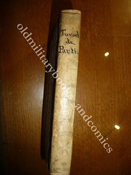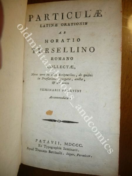 TITOLO: PARTICULAE LATINAE ORATIONIS AB HORATIO TURSELLINO COLLECTAE, NUN VERO EX ALIIS SCRIPTORIBUS, DE QUIBUS IN PRAEFATIONE, PURGATAE, ET AUCTAE, ET AD USUM SEMINARII PATAVINI ACCOMODATE DESCRIZIONE: Ex Typographia Seminarii : apud Thomam Bettinelli Patavii 1800, legatura in mz. pelle, pp. 276 in 16° dimensioni 10x17 cm. L'autore, storico e letterato italiano, era figlio di un semplice pescivendolo e crebbe nel quartiere romano di Campo Marzio. Entrato a far parte della Compagnia di Gesù scrisse libri sul cristianesimo, sulla storia del mondo e sulla grammatica latina. Le sue opere ottennero un notevole successo, furono più volte ristampate e tradotte in italiano e in francese. CONDIZIONI: Buone/Ottime, lievi abrasioni alla cop. posteriore alla parte alta. Firma di possesso alla pima bianca. PESO / WEIGHT: 200 gr. without packag