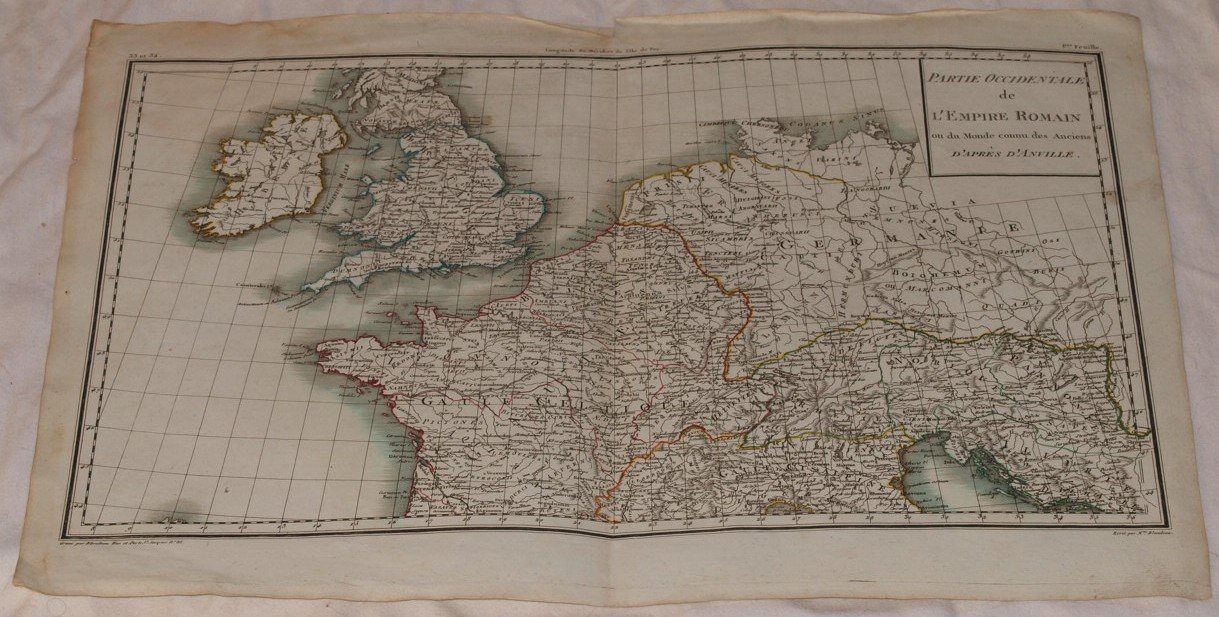 Bella mappa su rame acquarellata a mano coeva di grandi dimensioni del 1805 che rappresenta la parte occidentale dell'Impero Romano o del mondo conosciuto dagli antichi. TECNICA: Incisione su rame COLORE: Acquarellatura a mano coeva AUTORE: A. Blondeau (1799-1828) DIMENSIONI FOGLIO: cm 58,5x42,5 DIMENSIONI INCISIONE: cm 55x35 EPOCA: 1805 CONDIZIONI: Buone condizioni, qualche strappetto marginale. Beautiful copper map of 1805 representing the Western part of Roman Empire or the world known by ancient people. TECHNIQUE: copper engraving COLOUR: Colour with aquarello by hand AUTHOR: A. Blondeau (1799-1828) PAGE SIZE: cm 58,5x42,5 PRINT'S SIZE: cm 55x35 PERIOD: 1805 CONDITION: good conditions. Little tears in the edges.
