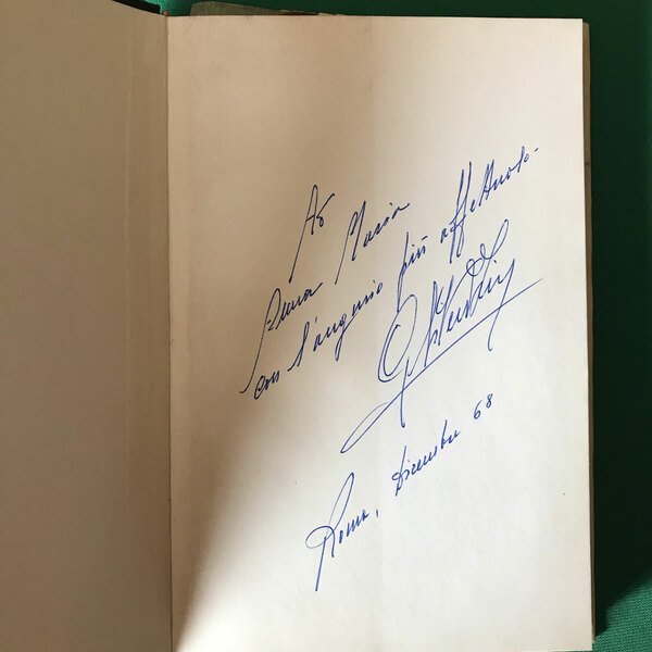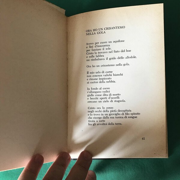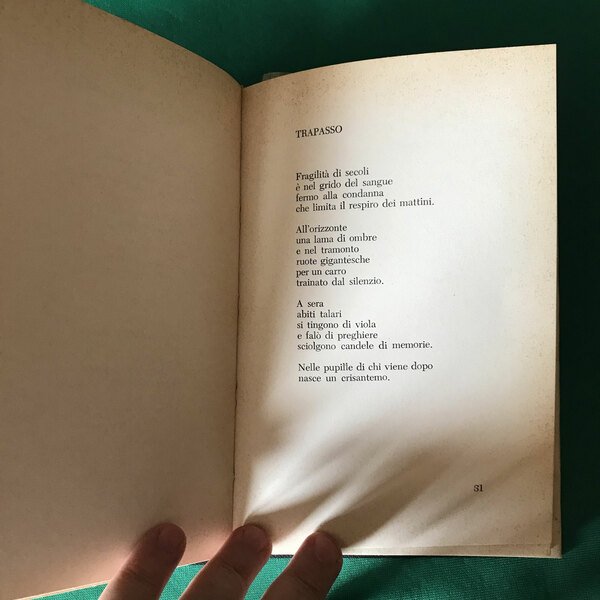 Cartonato con sovraccoperta. Cm 22x14. 91 pagine. Dedica autografa del dicembre 1968. Ottimo stato di conservazione con leggera brunitura delle pagine, dovute alla normale usura del tempo. Qua e là qualche segno di matita rossa in calce alle poesie