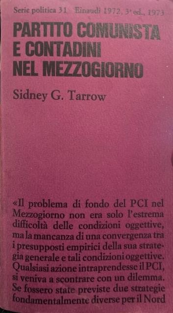 3. ed. XI, 391 p. ; 18 x 11 cm. Serie politica, 31. Come sottolinea l'autore il "problema di fondo del PCI nel Mezzogiorno non era solo l'estrema difficoltà delle condizioni oggettive, ma la mancanza di una convergenza tra i presupposti empirici della sua strategia generale e tali condizioni oggettive. Qualsiasi azione intraprendesse il PCI, si veniva a scontrare con un dilemma. Se fossero state previste due strategie fondamentalmente diverse per il Nord e per il Sud, il partito avrebbe messo a repentaglio la sua stessa integrità in quanto partito leninista; e d'altro canto, se la strategia prevista per la Valle Padana e per le città industriali del Nord fosse stata applicata meccanicamente al Sud, ne sarebbero conseguite certe sconfitte politiche. I dirigenti del partito furono restii ad operare una scelta, anche se sembrano essere stati continuamente consci del loro dilemma. Nella misura in cui l'Italia resta un paese con una cultura politica dualistica, nel cuore della via italiana al socialismo é insita una contraddizione di fondo". Titolo originale: Peasant communism in southern Italy. Traduzione di Emilio Soave. . Brossura editoriale, coperta in cartoncino flessibile opaco di colore viola, titolo impresso in nero al piatto e al dorso. Alcuni segni del tempo, per il resto libro integro. Codice libreria 9878.