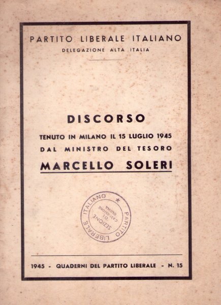 Partito Liberale Italiano, Delegazione Alta Italia. Discorso tenuto in Milano il 15 luglio 1945 dal MInistro del Tesoro Marcello Soleri.
