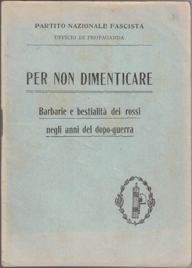 Partito Nazionale Fascista – Ufficio di Propaganda, Per non dimenticare. Barbarie e bestialità dei rossi negli anni del dopo-guerra, s.n., s.l. (ma stampato a Roma, presso la Tipografia Ditta L. Cecchini) 1924, pp. 63, cm 17, rilegatura a punto metallico. Opuscolo di propaganda anticomunista. Minime fioriture, per il resto bell’esemplare.