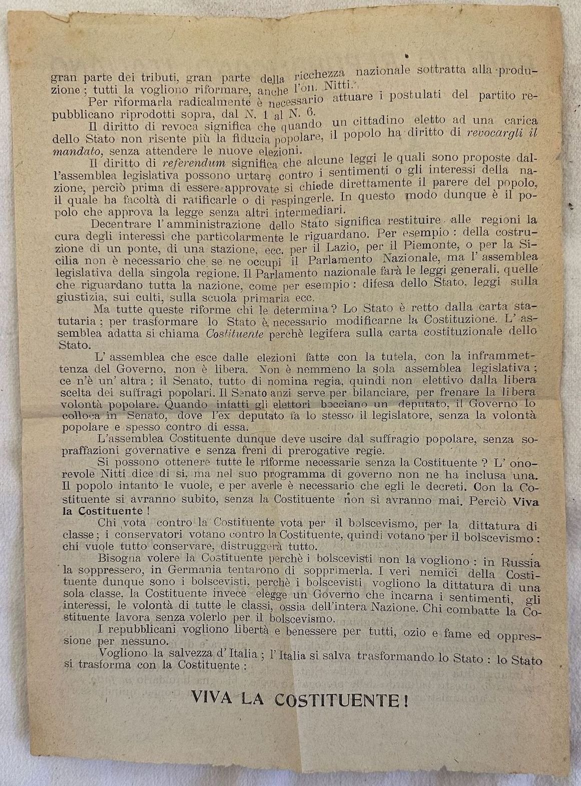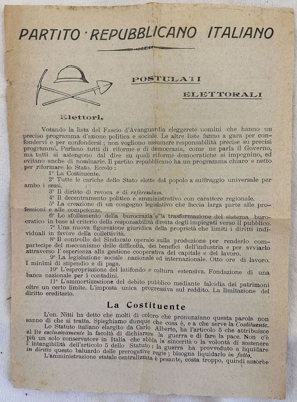 Rarissima locandina di propaganda del Partito Repubblicano Italiano per le elezioni politiche del 1946. In buone condizioni. Piegature. Dim. 28x20,5 cm. Very scarce pamphlet of propaganda of Partito Repubblicano Italiano for the political elections of 1946. In good conditions. Foldings. Dim. 28x20,5 cm.